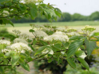 Ongeveer eind mei bloeit deze Cornus met kleine, crème witte bloemen die in horizontale schermen staan (zie foto). De bloemen geuren licht en komen boven het blad uit. Een volledig in bloei staande boom kan vol zitten met deze bloem schermen. Na de bloei in juli /augustus vormt deze boom zwarte besjes die geliefd zijn bij vogels. Wat de standplaats betreft is Cornus alternifolia niet kieskeurig, alleen op plaatsen met veel schaduw zal hij slecht groeien en bloeien. Ook snoeien verdraagt Cornus alternifolia goed , wel is het aan te bevelen om oog te houden voor de karakteristieke etage groeivorm. Cornus alternifolia is goed winterhard