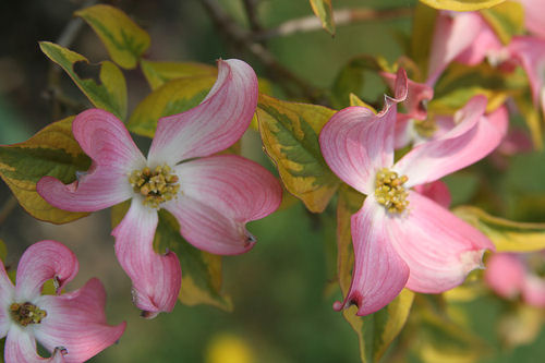 Deze cultivar van Cornus florida is geselecteerd om zijn fraaie geel gerande bladeren. Deze lijken veel op die van Cornus florida ‘Rainbow’ alleen zijn de groeitoppen bij ‘Sunset’ roder van kleur. De Groei van Cornus florida ‘Sunset’ is, net als bij de meeste bontbladige soorten, aanzienlijk minder sterk als bij de soort. Desondanks groeit hij wel gezond en goed.Uiteindelijk wordt 'Sunset' mooie compacte struik, die,wanneer hij niet wordt gesnoeid, ongeveer een hoogte van 2,5 m krijgt. De bloemen van 'Sunset' verschijnen vanaf half april en zijn omgeven door 4 helderrode bracteen. De overige eigenschappen zijn gelijk als bij Cornus florida waarbij moet worden opgemerkt dat de herfstverkleuring bij 'Sunset' ,juist door het geelgerande blad, wel erg spectaculair is.